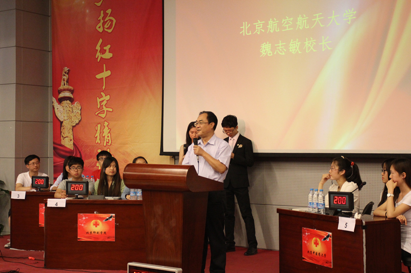 在知识竞赛开始阶段,北航副校长魏志敏先生致“人道,博爱,奉献”开幕词,为全场参赛队员及观众加油打气。
