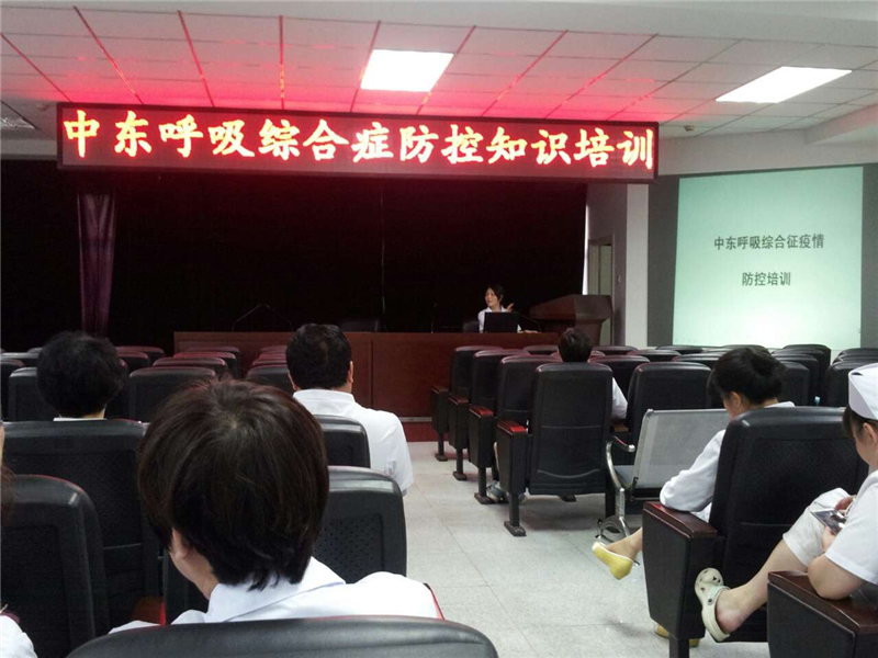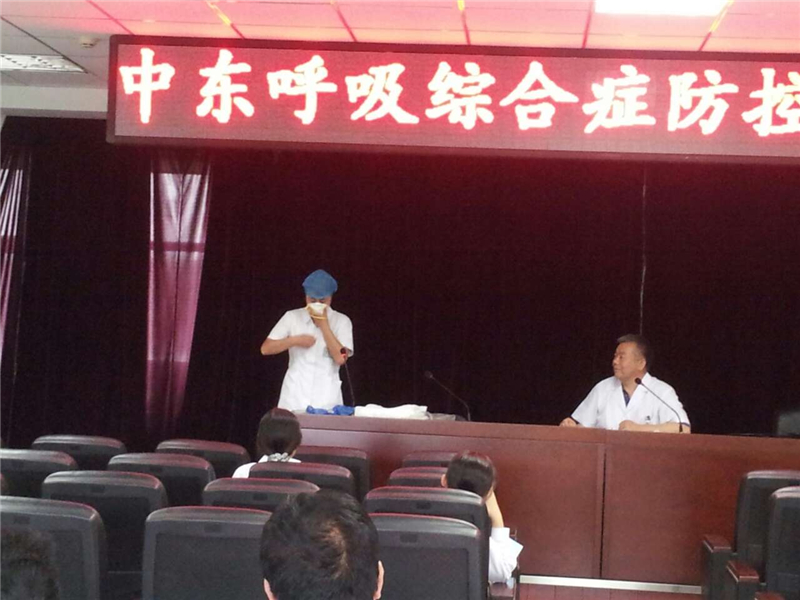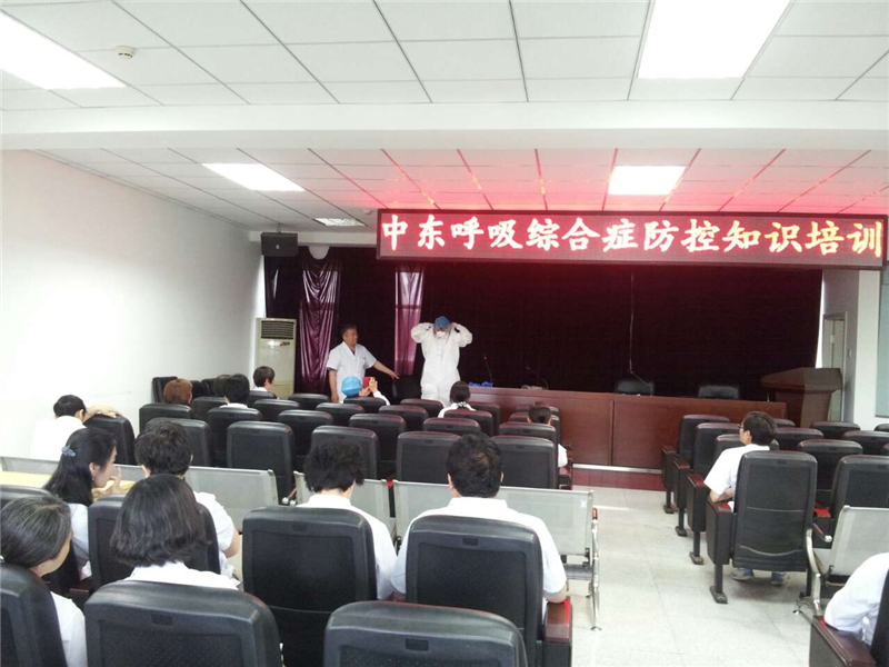 这次培训的主要内容主要包括中东呼吸综合征的背景、当前的疫情及防控方案三方面,保健科石巧玲大夫为大家详细讲解了中东呼吸综合征的病例定义、鉴别诊断、流行病学调查、标本采集、病例的管理与救治等内容。并以车文丽护士的亲身示范告诉职工如果发生类似疫情,如何进行流调人员的个人安全防护、如何做好消毒工作。要求临床科室医护人员在日常诊疗中,要提高对警觉性,如遇到不明原因肺炎的患者,要仔细询问流行病学史,如发现符合中东呼吸综合征病例定义的患者,应及时报告保健科。