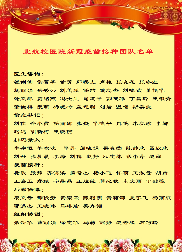 院长张新华是接种团队的“主心骨”,他在接到上级通知的第一时间发声指导、研判形势、科学部署,使北航成为北京市各高校组织集中疫苗接种的学习标杆。他日日驻守在接种现场,亲历躬行,热心耐心地解答问题,“院长一直在现场陪伴鼓励着我们,是我们的坚强后盾。”他如一面旗帜感召着全院职工奋进。副院长曹丽娟是接种团队的“参谋长”,她经历过非典和甲流时期,以丰富的一线预防接种和校园疫情防控经验指导工作,对每项安排给出有效安全的意见。前期接种准备时间短、头绪多,保健科主任石巧玲克服困难,迅速消化接种技术方案内容,积极筹备,尽职尽责地站好最后一班岗。