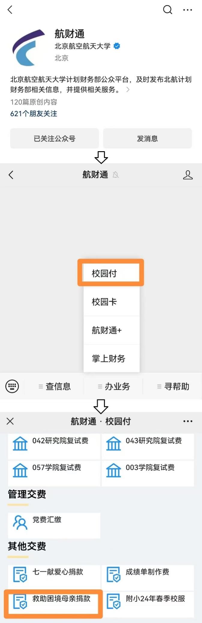【捐款方式】请各单位教职工在微信搜索“航财通”进入页面下方点击“办业务---校园支付---救助困境母亲捐款”,填写单位名称、捐款金额、捐款人数、交款人姓名等信息,完成捐款。